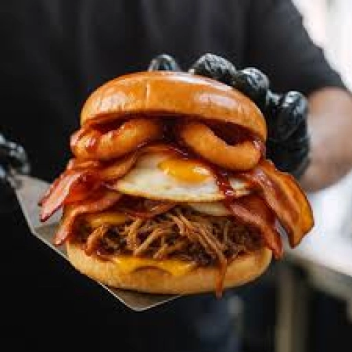 PÃO BRIOCHE, BLEND 180G, MOLHO ESPECIAL DA CASA, MUSSARELA, CARNE DESFIADA, CEBOLA ROXA, QUEIJO COALHO, BACON, BANANA D... Ver completo